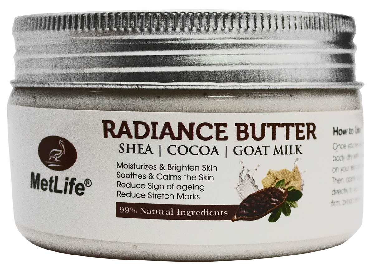 radiance and whitening butter for the face & body made with Shea butter, Cocoa butter, and goat milk. Protect and nourish very dry skin like never before with our new and improved Body Butter. Now made with 97% ingredients of natural origin, our Body Butter is specially formulated to provide immediate and long-lasting softness to dry skin. We use only premium ingredients many of which are reputed to provide deep and long-lasting hydration to dry skin. Also provides an aromatherapy experience that enhances the state of mind and well-being with delightfully fragrant aromas.